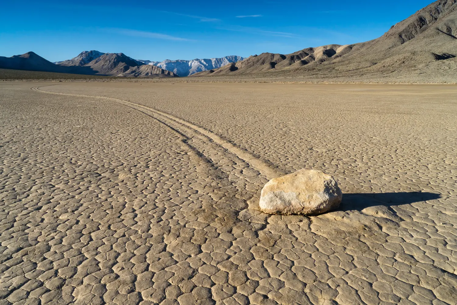 Localizado em uma área remota ao norte do Parque Nacional do Vale da Morte, The Racetrack é um lago seco famoso por suas misteriosas “pedras à vela” – rochas que parecem se mover pela praia, deixando longas trilhas para trás. O melhor lugar para ver isso é na arquibancada, um par de montes rochosos escuros que se erguem da paisagem plana e rachada.