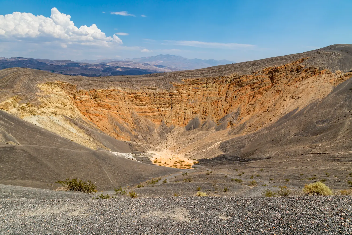 A Cratera Ubehebe é um marco incrível no Parque Nacional do Vale da Morte. Esta cratera vulcânica de 600 pés de profundidade é o resultado de um vulcão maar, também conhecido como poço de explosão. Aqui, a lava derretida entrou em contato com as águas subterrâneas, acumulando pressão suficiente para explodir e deixando para trás esta enorme cratera.