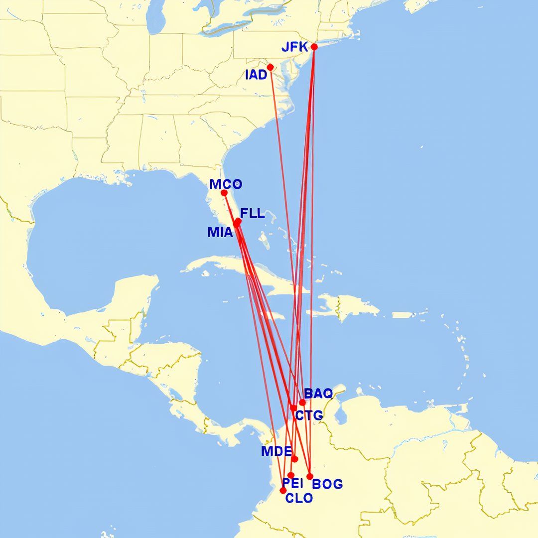 Principal US cities on the routes include Atlanta (ATL), Miami (MIA), New York (JFK), and Washington Dulles (IAD). The most popular South American destinations include Bogotá (BOG), Rio de Janeiro (GIG), São Paulo (GRU), and Lima (LIM).