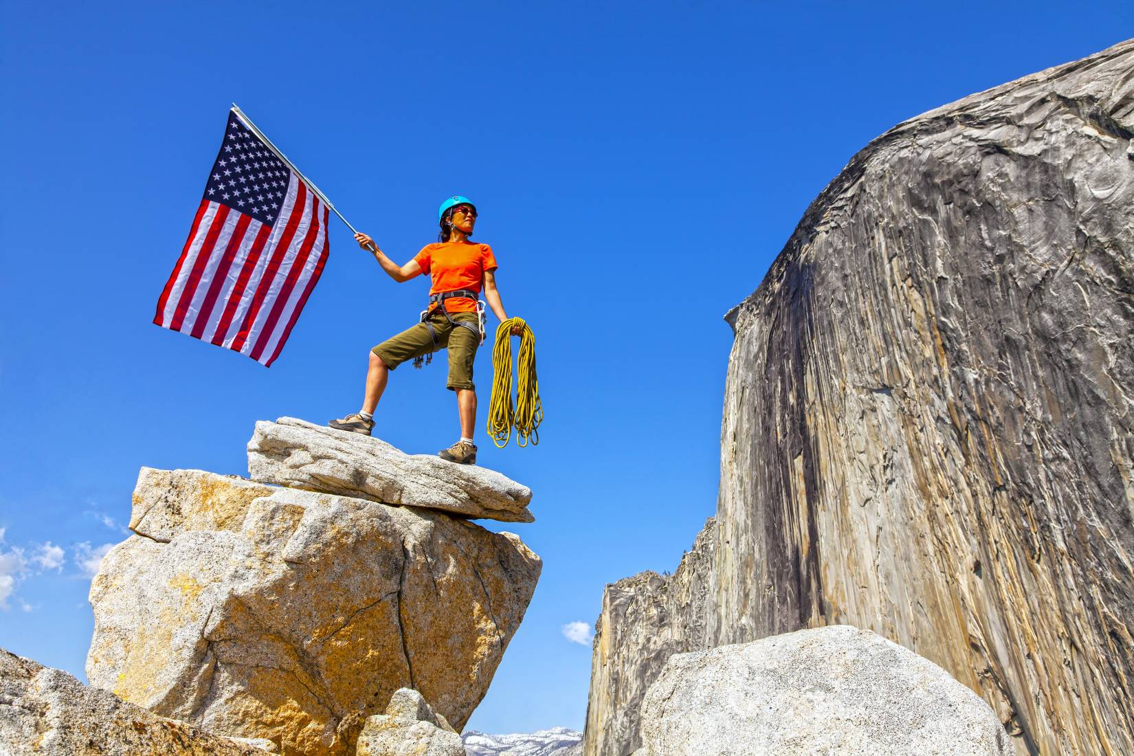 Alpinista hasteando bandeira dos EUA em El Capitan, no Parque Nacional de Yosemite, Califórnia, CA, EUACrédito: Shutterstock
