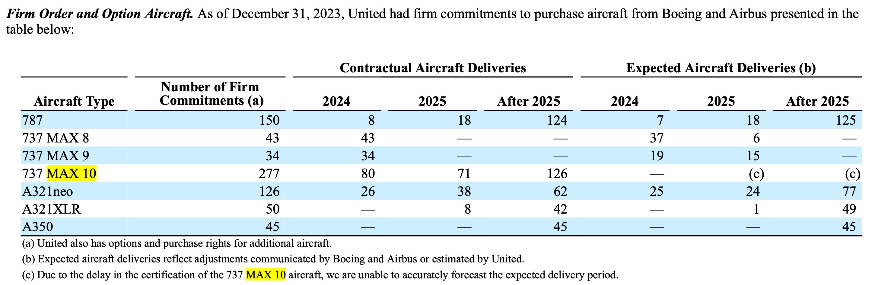 Entre 2024 e 2025, a United deveria receber mais da metade de seu pedido MAX 10. Embora o pedido 10-K afirme que a United não espera nenhum MAX 10 nos próximos anos, a companhia aérea especificou,