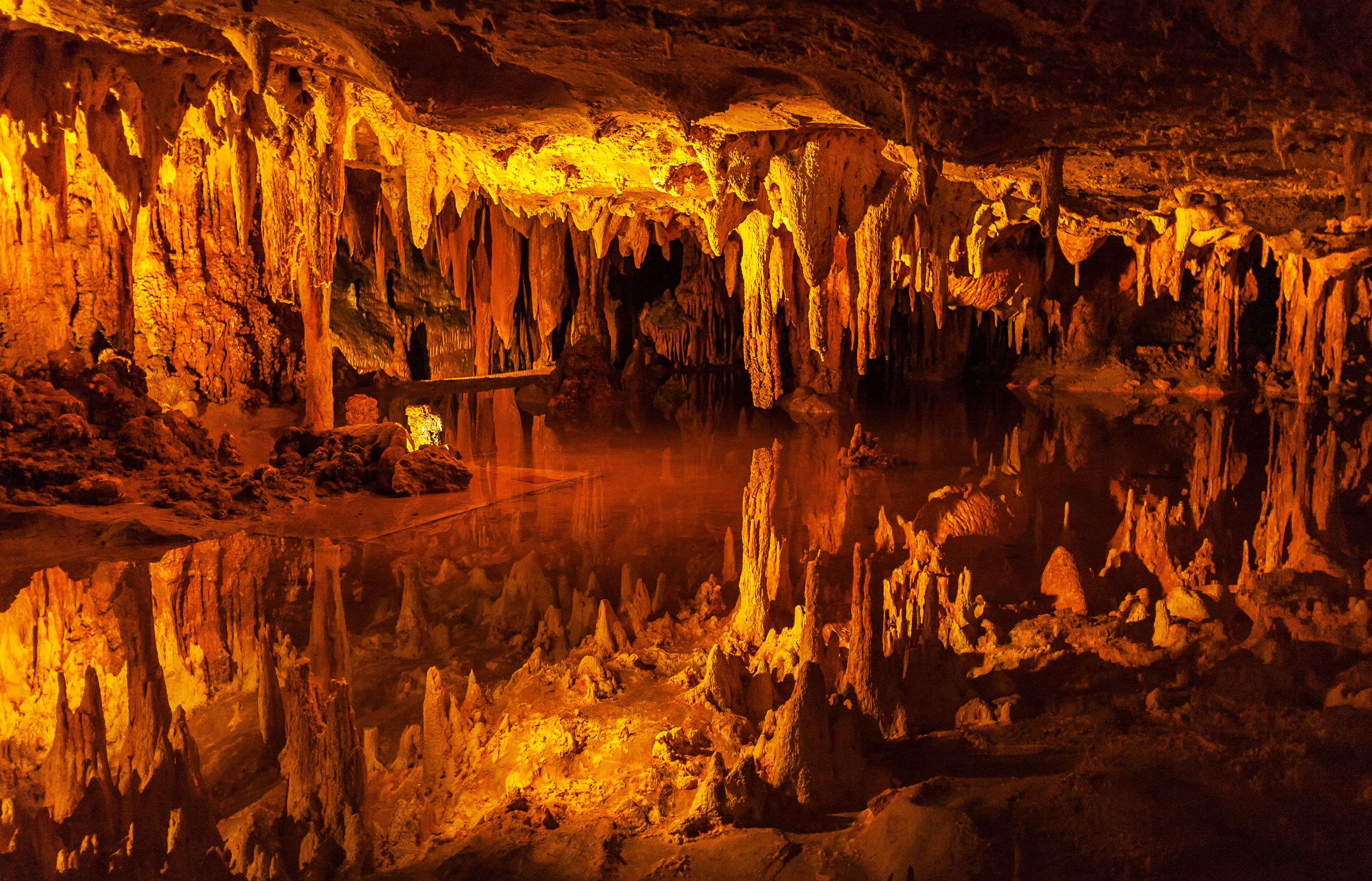 Muitas das formações calcárias da caverna parecem “fluir”, quase como se estivessem derretendo em câmera lenta. Ao mesmo tempo, os lagos subterrâneos criam um efeito de espelho hipnotizante ao refletirem as complexas formações rochosas acima deles. As formações rochosas da Caverna Luray também assumem uma gama única de cores (incluindo tons de branco, vermelho e amarelo) graças à composição química única do calcário calcita. E mesmo que a caverna em si apresente um complexo de formações rochosas irregulares, você pode desfrutar de um passeio a pé pela caverna graças à suaPassarela pavimentada de 1,25 milhas!