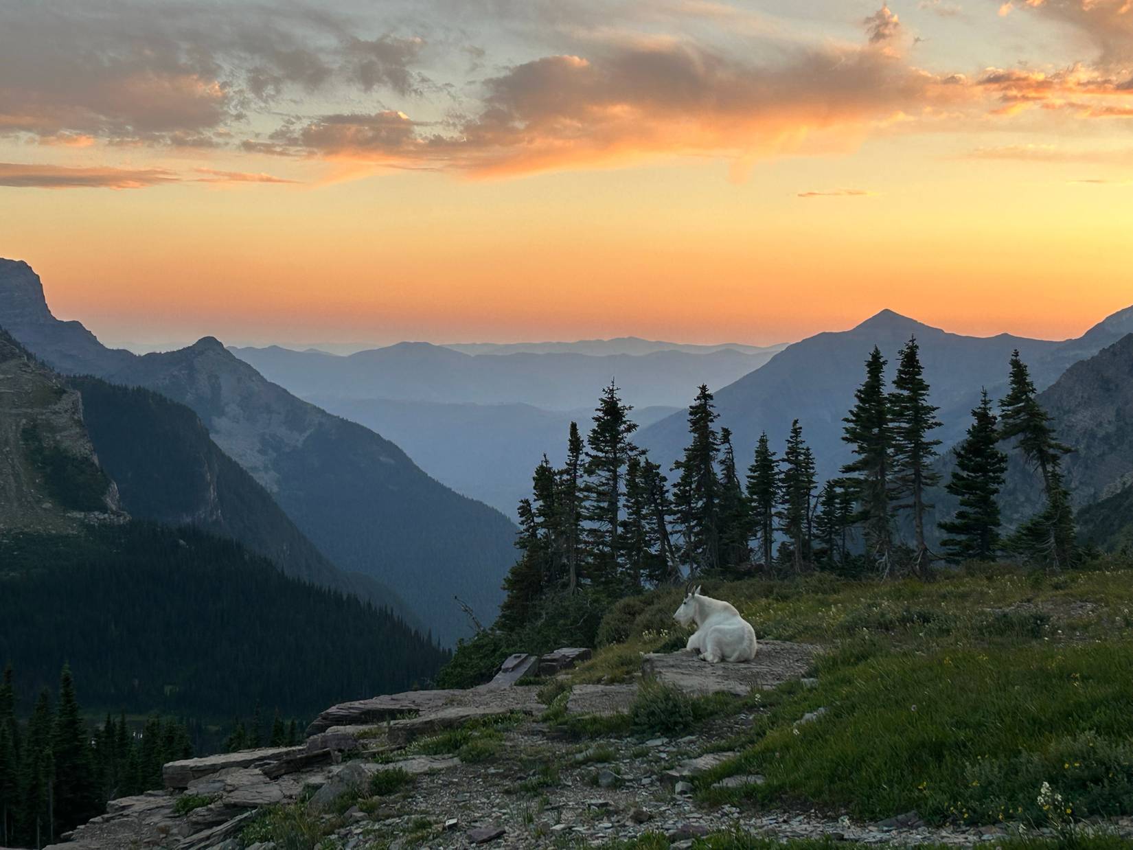 Uma cabra montesa (Oreamnos americanus) apreciando o pôr do sol no Parque Nacional GlacierCrédito: MonaLQ / Shutterstock