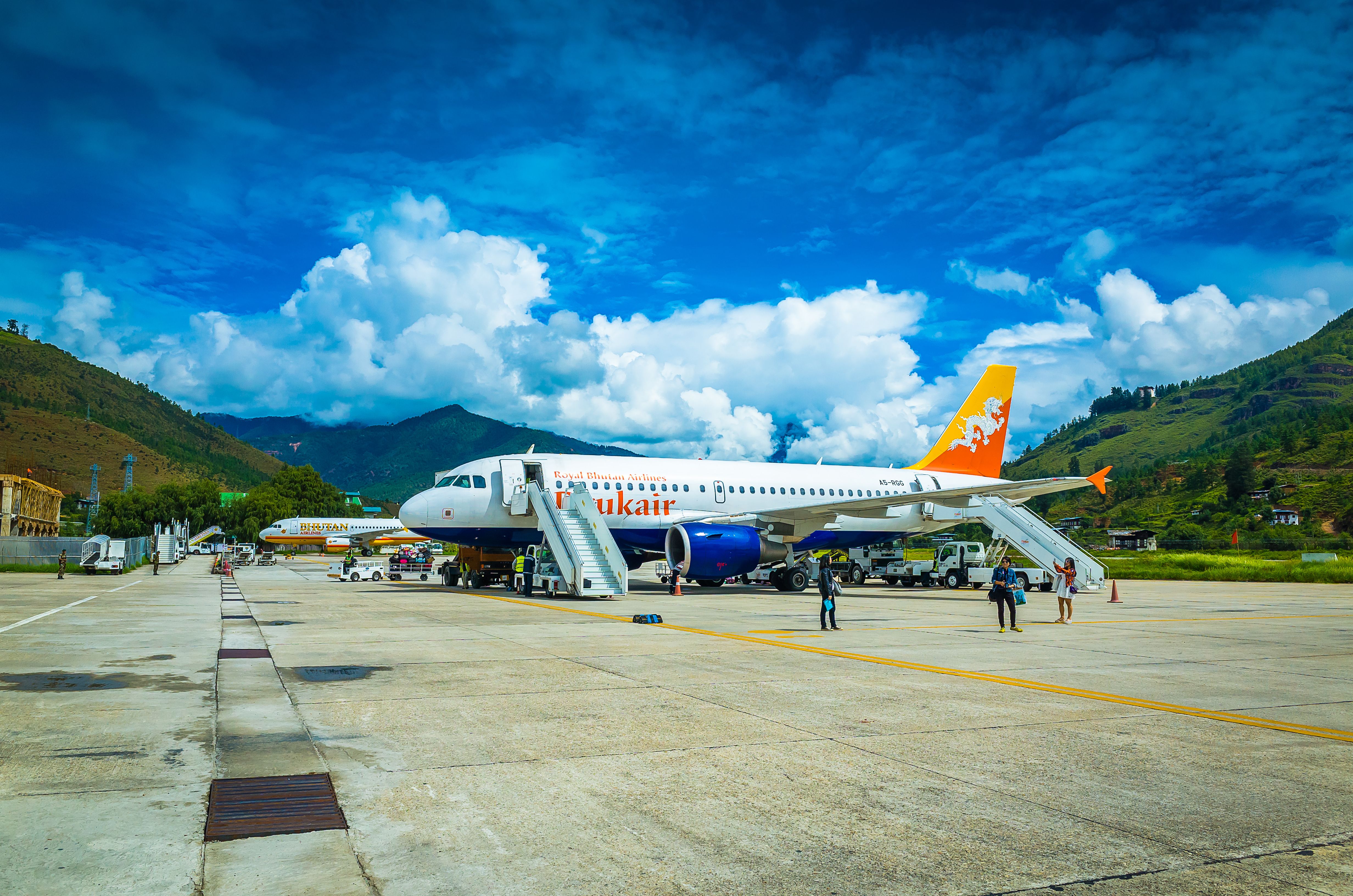 Apenas duas companhias aéreas voam para o Aeroporto Internacional de Paro. A companhia aérea estatal Drukair, também conhecida como Royal Bhutan Airlines, possui cinco aviões em sua frota. Três deles são Airbus A319-100, há um único turboélice ATR 42 e a companhia aérea recebeu um Airbus A320neo totalmente novo em março de 2020. A Bhutan Airlines, de propriedade privada, também é fã do A319, já que seus dois aviões são deste tipo.
