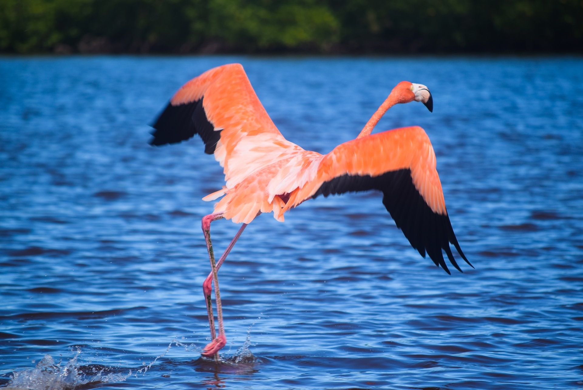 A flamingo flying over a lake in Ria Lagartos, Yucatan Peninsula, Mexico