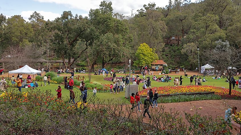 Um festival de tulipas no Parque Botânico Araluen, perto de Perth, Austrália Ocidental. Crédito editorial: BJP7images/Shutterstock.com.