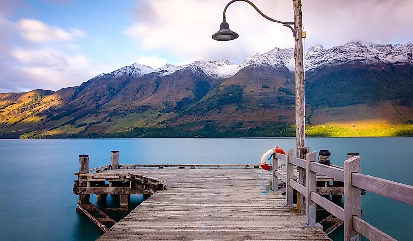 Cais de madeira e lâmpada do cais de Glenorchy após o nascer do sol, ilha sul da Nova Zelândia