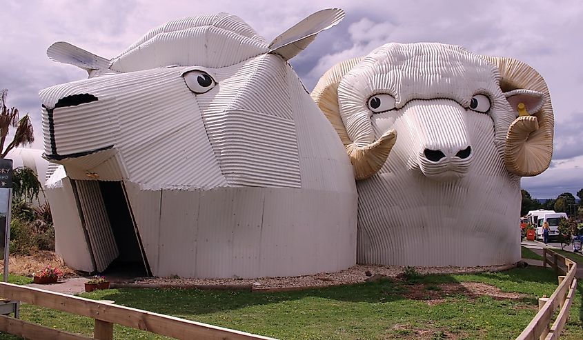 Enorme construção de ovelhas de boas-vindas, Tirau, South Waikato, Nova Zelândia. Crédito da imagem Shachima via Shutterstock