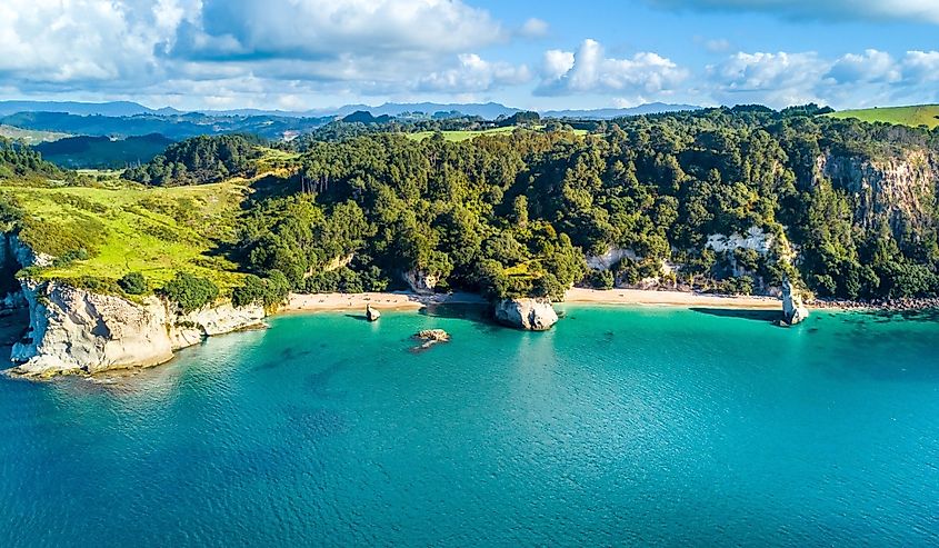 Do outro lado do Golfo Hauraki, a partir de Auckland, fica a idílica cidade de Coromandel, na Península de Coromandel. Por aqui, você encontrará algumas das praias mais espetaculares da Nova Zelândia, incluindo a enseada protegida na Baía de Oamaru e as excelentes condições para remar em Long Bay. Mais adiante, o Coromandel tem a sonhadora Cathedral Cove, uma praia extraordinariamente linda com areia branca e fofa, águas esmeraldas deslumbrantes e condições perfeitas para nadar, andar de caiaque, praticar snorkeling e mergulho.