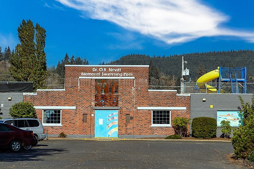 Um prédio com piscina na cidade de Raymond, Washington. Crédito editorial: CL Shebley / Shutterstock.com