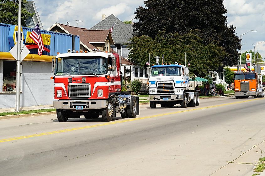 Desfile de semi-caminhões passando pela rua principal de Waupun, Wisconsin, Crédito editorial: Aaron of L.A. Photography / Shutterstock.com
