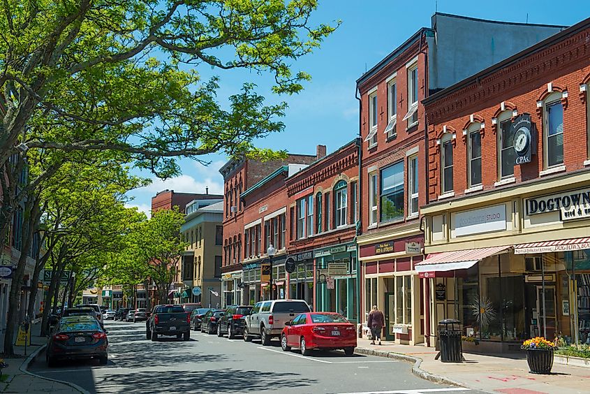 Edifícios comerciais históricos na Main Street, no centro de Gloucester, Massachusetts, via Wangkun Jia / Shutterstock.com