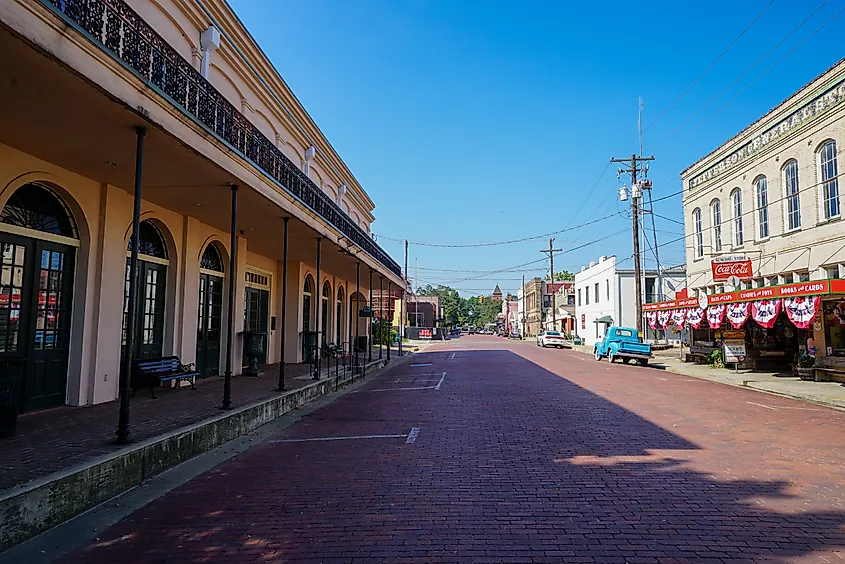 Nacogdoches, Texas: A vista do centro da cidade, com antigos edifícios históricos e ruas cobertas de tijolos, via Roberto Galan / iStock.com
