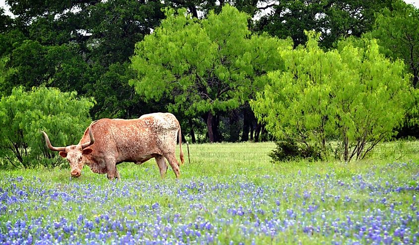 Longhorn em pé no campo bluebonnet perto de Georgetown. Crédito da imagem Phil Ostroff via Shutterstock.