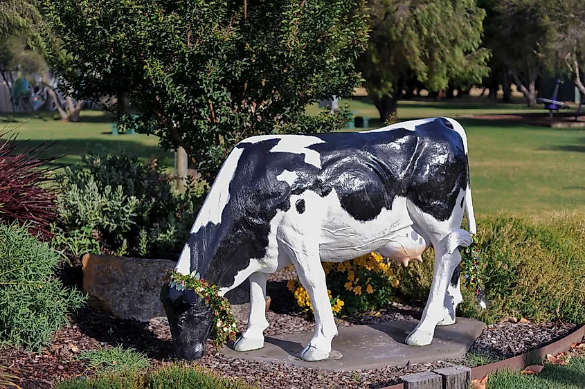 Estátua de vaca em tamanho real na cidade de Cowaramup, Austrália Ocidental. Crédito da imagem Anne-tipodees via Shutterstock
