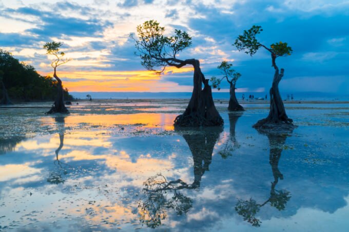 A bela ilha de Sumba, na Indonésia, é um dos destinos mais subestimados do mundo, com uma série de paisagens incríveis e uma cultura única. No interior, você encontrará colinas escarpadas e florestas tropicais repletas de vida selvagem exótica. Ao redor de suas costas estão algumas das mais belas praias do arquipélago, mas nenhuma é mais exclusiva do que a Praia de Walakiri, com seus manguezais semelhantes a alienígenas espalhados pela praia. É o local perfeito para ter uma vista incrível do pôr do sol refletido nas águas rasas da praia.