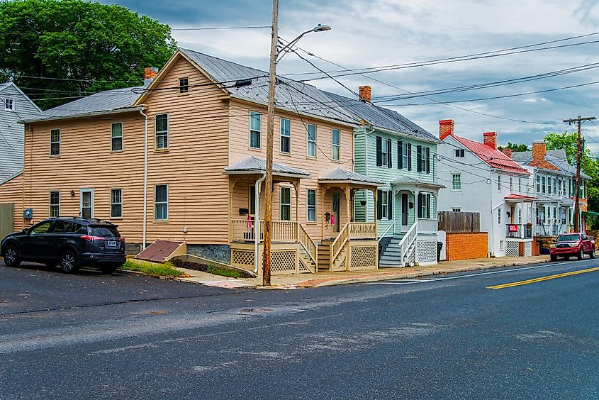 Casas coloridas em uma rua histórica em Winchester, Virgínia, via Kosoff / Shutterstock.com