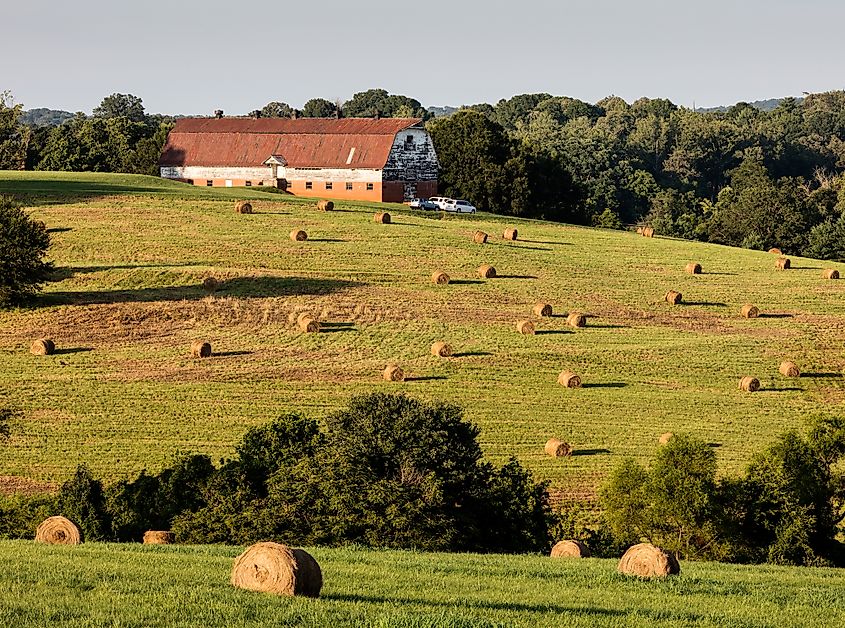 Vista do pôr do sol de uma fazenda na Carolina do Norte com feno na cidade de Morganton, no Piemonte.