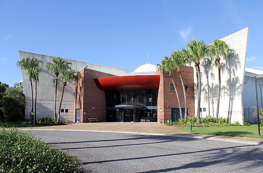 Edifício Leo Zussino cercado por palmeiras no campus Gladstone da Central Queensland University. Crédito editorial: Tammy27/Shutterstock.com