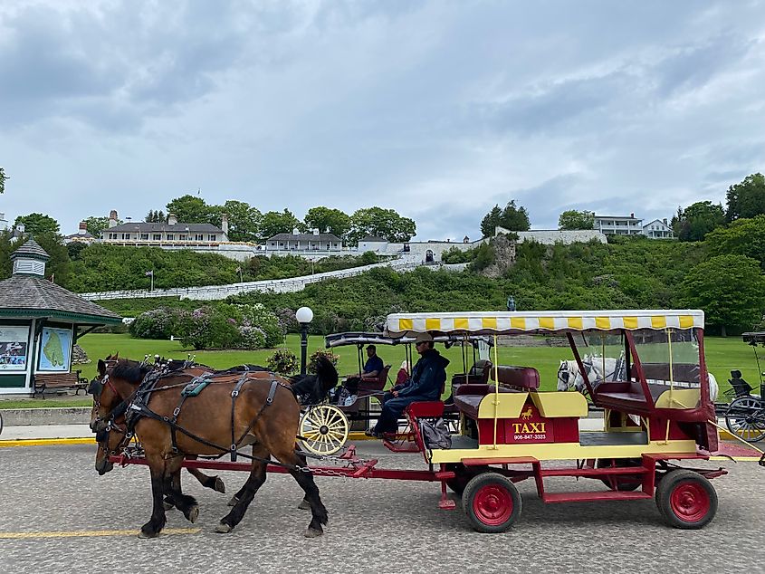 Outra carruagem puxada por cavalos passa por baixo do Forte Mackinac, no final da Main Street. Foto: Andrew Douglas