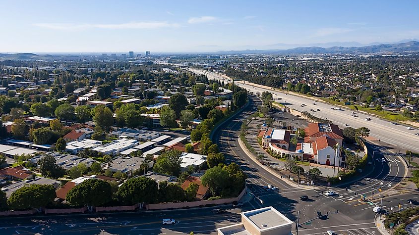 Vista aérea diurna do centro da cidade de Laguna Woods, Califórnia