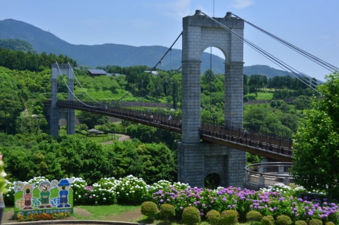 Uma das características mais marcantes do parque é a “Ponte Suspensa Kaze no”, que tem cerca de 35 metros de altura e se estende por aproximadamente 267 metros. A área ao redor da ponte é adornada com flores sazonais, criando um cenário pitoresco.