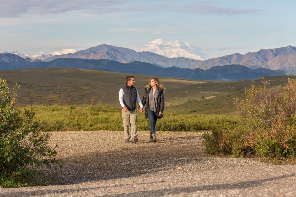Seu queixo certamente cairá quando as nuvens se separarem para revelar a vasta massa do pico mais alto da América do Norte, elevando-se a 20.310 pés de granito e gelo. Esta montanha majestosa serve como pano de fundo deslumbrante para uma paisagem já deslumbrante, os verdes suaves, ocres e ferrugem da tundra e da floresta cortada ao meio por uma única estrada com quilômetros de vida selvagem em ambos os lados, onde lobos, ursos pardos, caribus e ovelhas Dall vagam.