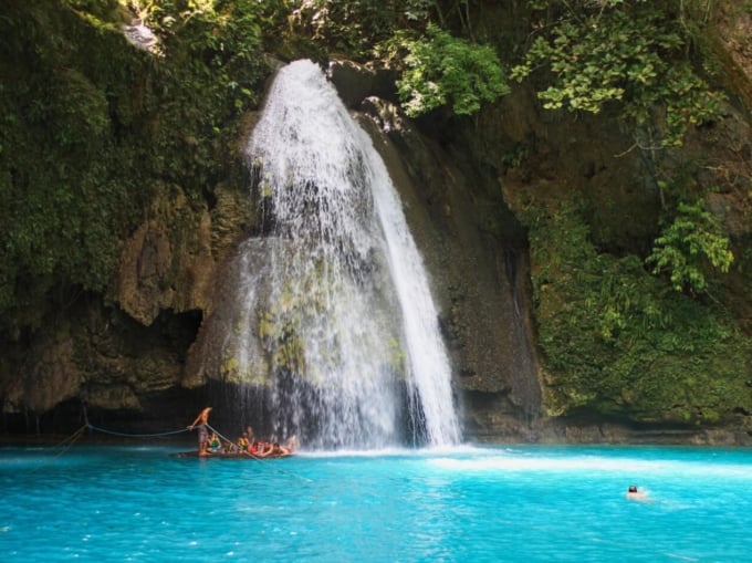 Kawasan Falls, a maior cachoeira de Cebu, tem uma piscina fantástica que parece tinta. A água cristalina é de um azul incrivelmente profundo ou verde esmeralda!