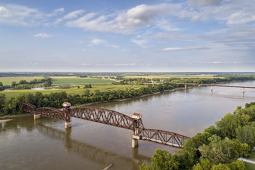 Ferrovia histórica Katy Bridge sobre o rio Missouri em Boonville com seção central elevada e deck de observação para visitantes - vista aérea.
