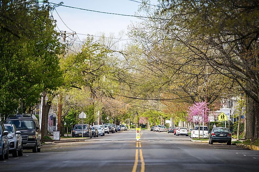 Uma rua tranquila em Cranbury, Nova Jersey.