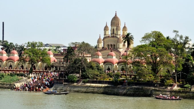 O Templo Dakshineswar Kali é conhecido por suas impressionantes paredes brancas com linhas vermelhas, e o salão principal apresenta um belo design com nove torres. No interior, há um ídolo de Kali, abaixo do qual está uma representação em mármore de Shiva em posição prostrada, rodeado por 1.000 flores de lótus prateadas.