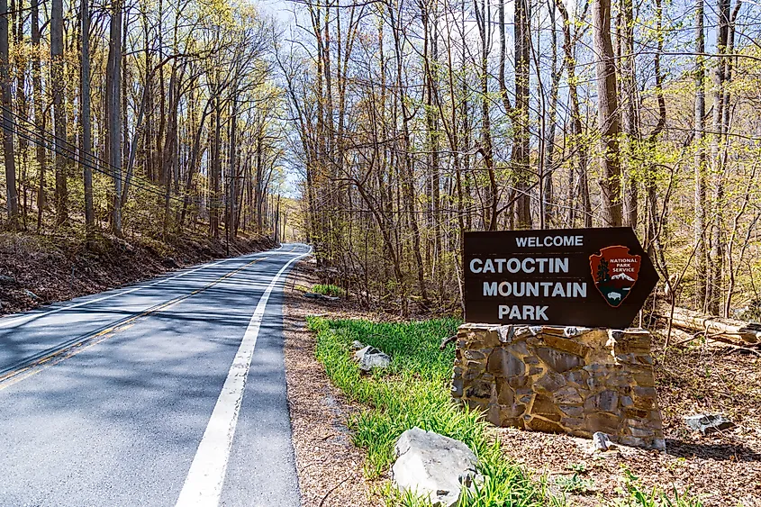A placa de boas-vindas no Catoctin Mountain Park, perto de Thurmont, Maryland. Crédito editorial: George Sheldon/Shutterstock.com