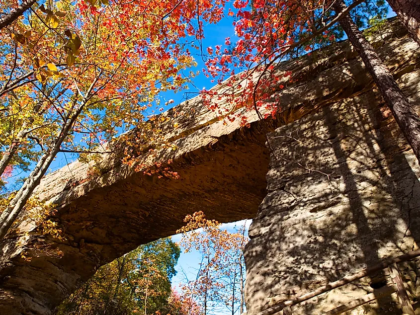 Ponte Natural em Slade, Kentucky, cercada por árvores coloridas no outono.