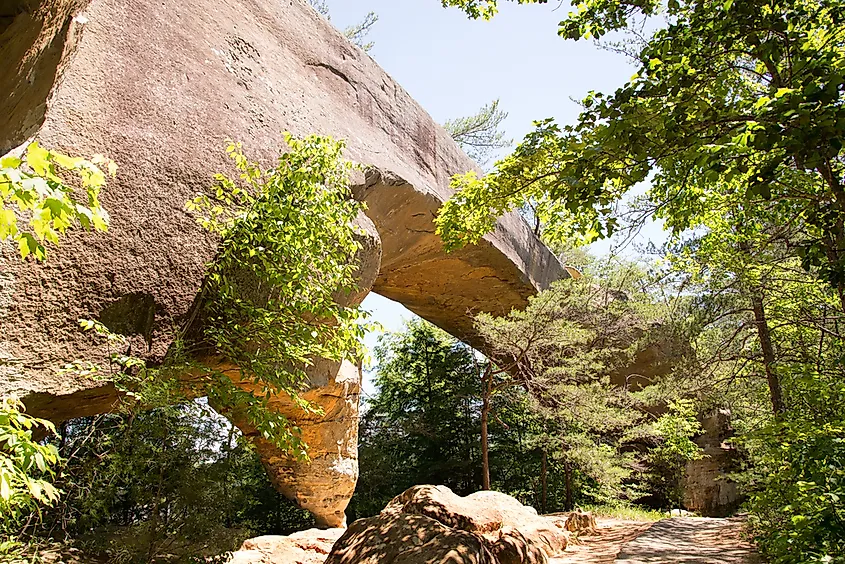 O parque contém cerca de 2.300 hectares de terreno acidentado, com uma variedade de trilhas que podem ser caminhadas fáceis ou subidas íngremes, dependendo de onde você for. A rota mais direta para o arco é pela Trilha Original, um caminho de menos de 1,6 km com ganho de elevação de 400 pés. Outras trilhas imperdíveis oferecem acesso a mirantes panorâmicos, como Lover’s Leap e Battleship Rock. Além disso, a localização da Natural Bridge na Área Geológica Red River Gorge conecta-a a uma rede mais ampla de falésias, abrigos rochosos e arcos naturais adicionais.