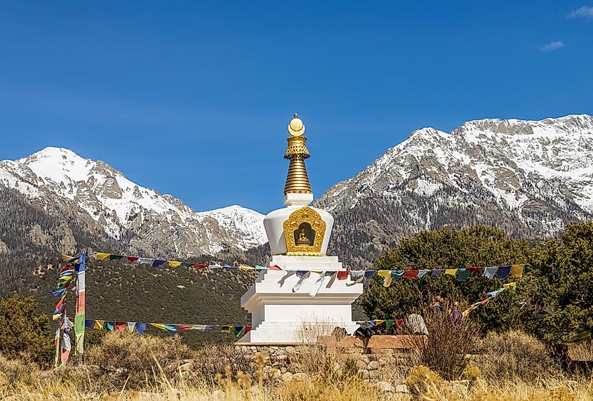 Crestone é uma cidade remota no alto deserto, na base das montanhas Sangre de Cristo, conhecida por sua concentração incomum de centros espirituais. Com menos de 200 residentes em tempo integral, a cidade abriga mais de duas dúzias de centros de retiro de vários tipos, templos, estupas e zendos que representam tradições do hinduísmo ao budismo tibetano, ao misticismo da Nova Era e muito mais. O Crestone Mountain Zen Center e o Haidakhandi Universal Ashram estão entre os mais estabelecidos. Como visitante, você pode organizar desde sessões de meditação guiada até retiros silenciosos ou explorar a estética distinta da área. Nos arredores da cidade, a Torre de Vigia de OVNIs, nas proximidades de Hooper, atrai outros viajantes curiosos que esperam capturar atividades aéreas inexplicáveis sob o céu escuro do deserto.