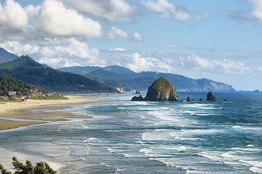 Cannon Beach com Haystack (também conhecido como “Goonies”) Rock