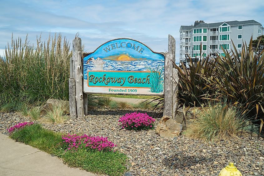 Placa de boas-vindas a Rockaway Beach, Oregon.