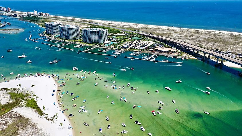 Perdido Pass cheio de barcos em Orange Beach, Alabama.