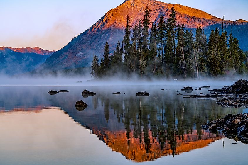 Nascer do sol sobre o Lago Wenatchee perto de Leavenworth, Washington.