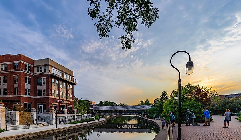 Downtown Naperville Riverwalk em uma movimentada noite de sábado oferece muitos restaurantes, bares, arte, entretenimento e arquitetura. Crédito da imagem Hendrickson Photography via Shutterstock