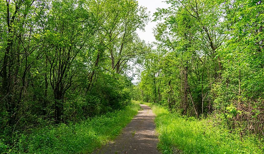 Trilha florestal com plantas e árvores verdes exuberantes em Red Gate Woods, ao norte de Frankfort. Crédito da imagem James Andrews1 via Shutterstock