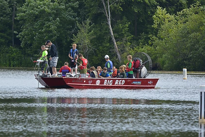 Um aerobarco cheio de pessoas pescando com arco e flecha em uma baía tranquila ao longo do lago Castle Rock. Crédito editorial: Tony Savino/Shutterstock.com