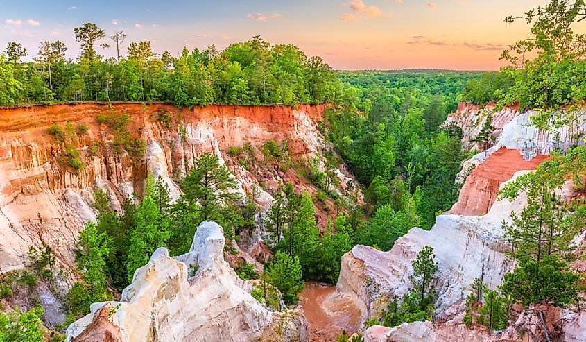 Providence Canyon parece uma maravilha completamente natural, mas este marco é na verdade o resultado de práticas agrícolas inadequadas de séculos atrás. A aragem pesada sem controle da erosão em 1800 fez com que a água da chuva escavasse ravinas enormes no solo argiloso e macio, criando eventualmente uma paisagem de 1.000 acres de desfiladeiros profundos, alguns com mais de 45 metros de altura, com camadas expostas de sedimentos vermelhos, laranja, rosa e brancos. Curiosamente, as cores mudam dependendo da luz e da umidade, dando à área uma aparência em constante mudança.