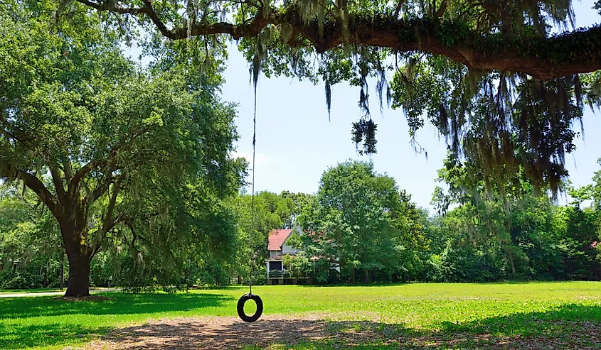 Balanços de pneus e musgo espanhol pendurado em carvalhos em McClellanville. Crédito da imagem Scott Woodham Photography via Shutterstock
