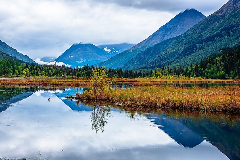 Vista do Lago Tern no outono, Moose Pass, Alasca.