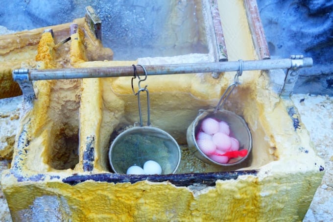 Durante a visita, você pode tentar fazer ovos onsen. A fonte termal aqui borbulha continuamente e vigorosamente, com uma temperatura de fonte de cerca de 100°C. Usando esse calor, você pode transformar ovos em ovos onsen – mas tome cuidado para não se queimar. Os ovos também são vendidos pela Associação Turística Atagawa Onsen e pousadas locais.