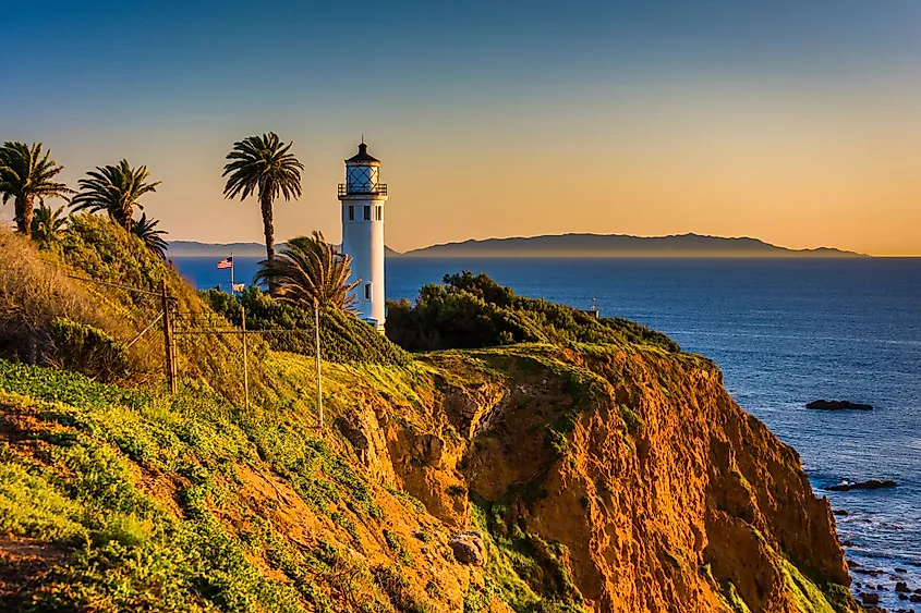 Vista do Farol de Point Vicente ao pôr do sol em Rancho Palos Verdes, Califórnia.