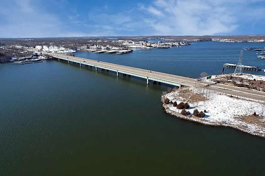 Embora grande parte da costa de 1.150 milhas do reservatório seja propriedade privada, a cidade oferece acesso público em locais como o Parque Estadual Ha Ha Tonka. Além da pesca, passeios de barco e passeios de cartão postal, este deslumbrante parque estadual é famoso por suas maravilhas geológicas. Isso inclui uma ponte natural encantadora, buracos e a 12ª maior nascente natural do Missouri. Depois de um piquenique à beira do lago, os caminhantes também podem percorrer a famosa Trilha do Castelo para ter vistas panorâmicas e dar uma olhada nas ruínas de um castelo do século XX.