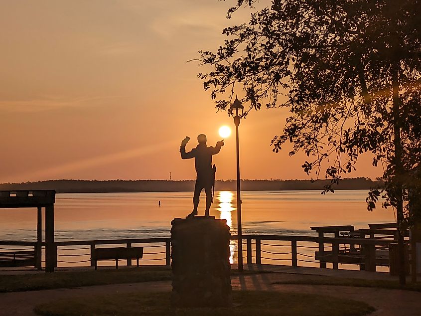 A estátua de Otway Burns no Bicentennial Park em Swansboro, Carolina do Norte, com vista para o rio White Oak.