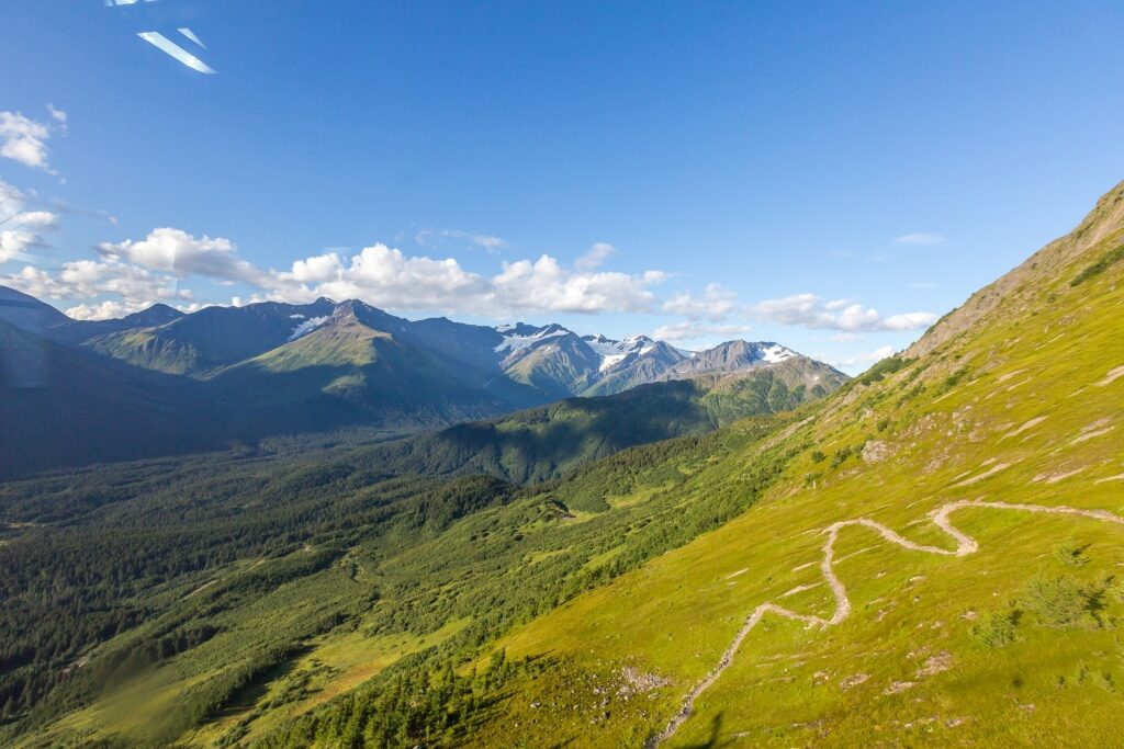 A cidade de Girdwood, cercada por montanhas e geleiras, é uma excelente base para passeios turísticos no Alasca. Você pode optar por um voo curto pelas encostas arborizadas ao redor da cidade, subindo o Monte Alyeska em busca de ursos e cabras montesas.